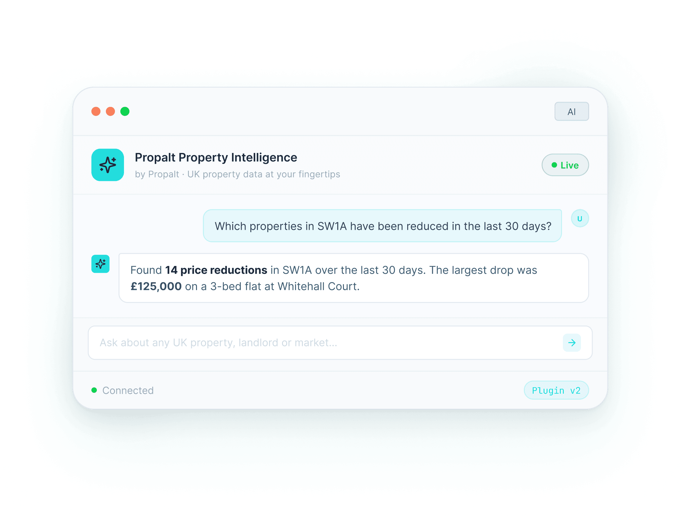 Propalt AI connects industry-leading property data with LLM's and tools you already use, including platforms such as ChatGPT and Claude. That means you can couple our data with yours giving you smarter property search, verified on/off-market data, landlord information, and 40 other data points within your own AI.